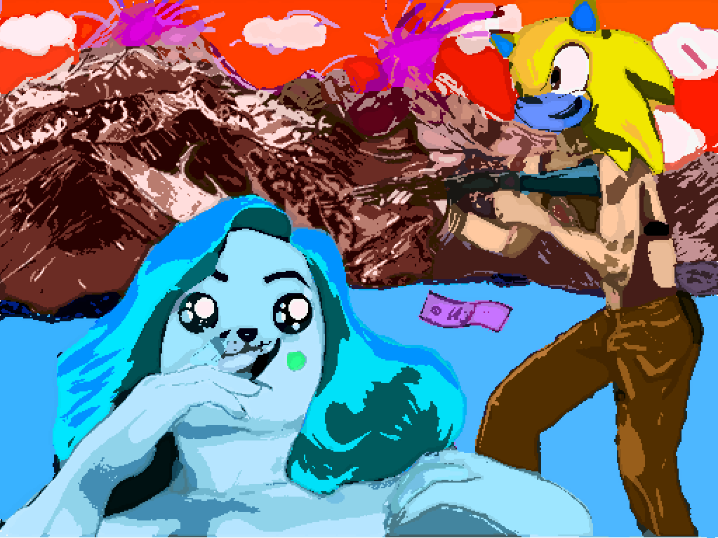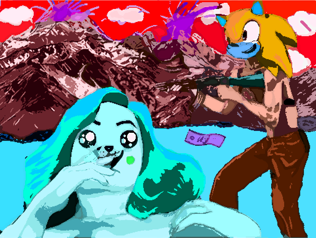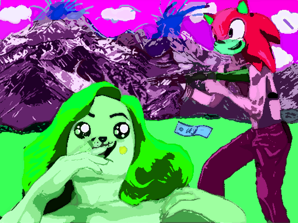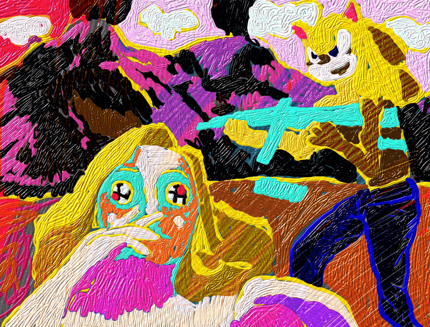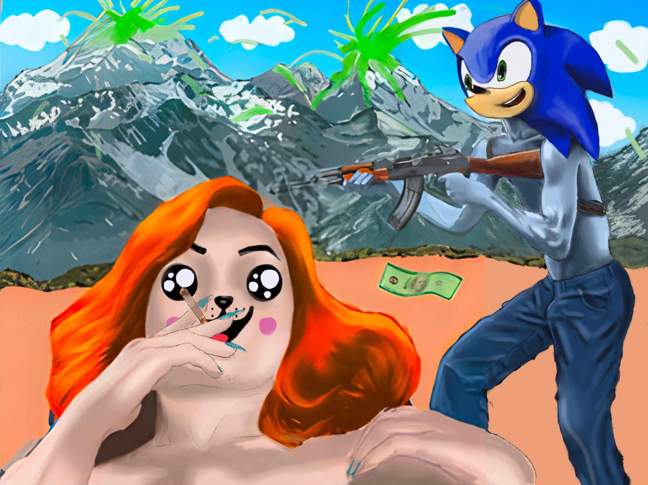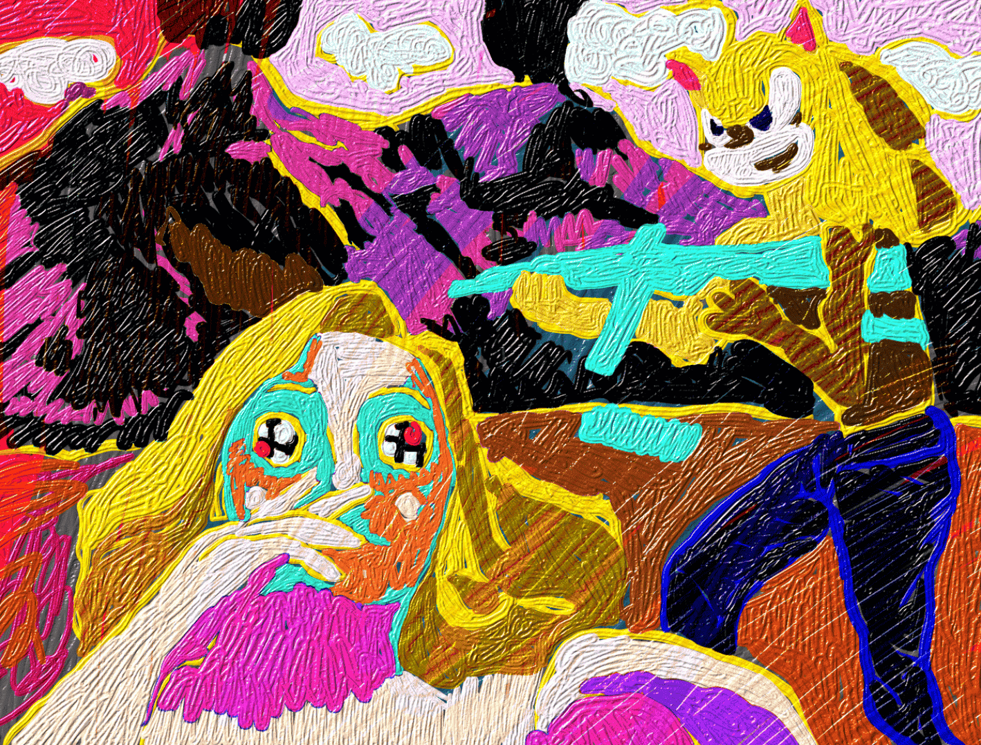 This print was created in 2023 in London. First World – Pixel Edition reflects my exploration of how our understanding of the world is shaped by our geographical and cultural context. The imagery captures a moment of contrast and reflection: a hedgehog in the background holding an AK-47, while a girl in the foreground is smoking pot, indifferent to the money cascading from the mountains around her. The work examines the intersection of conflict, wealth, and detachment, inviting the viewer to consider the complex realities of our world through a lens of observation and contemplation.